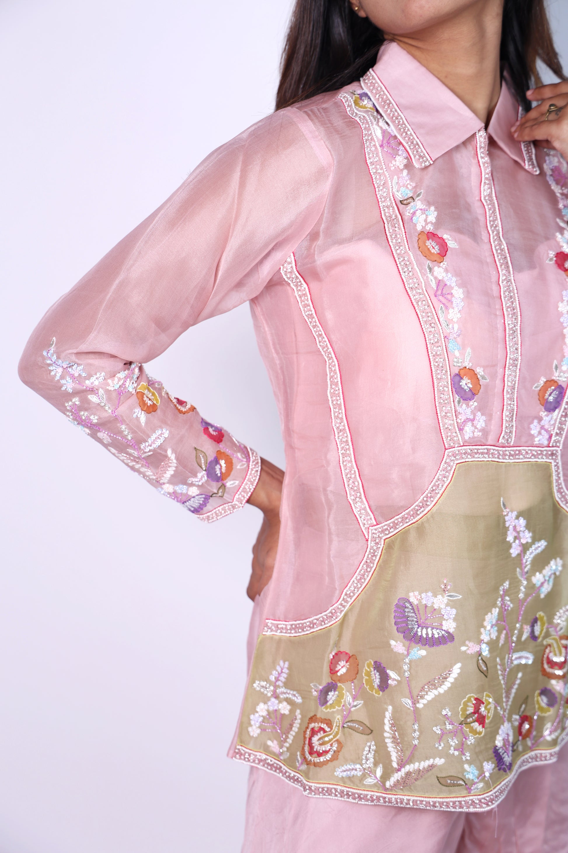 Elegant Sage Flora Pink Hand Embroidered Cord-Set